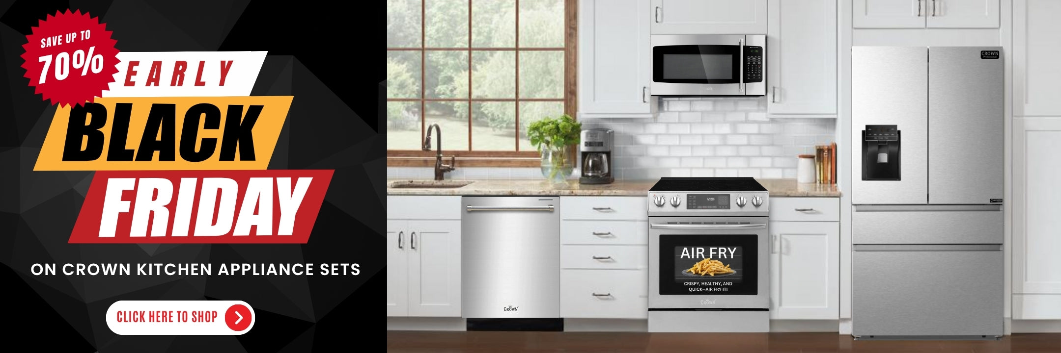 Crown 4-Piece Bundle Set: 30" Electric Range + 30" Under Cabinet Range Hood + 36" Fridge + (FREE Gift) 24" Dishwasher