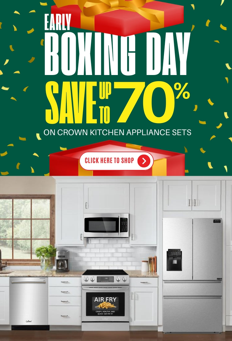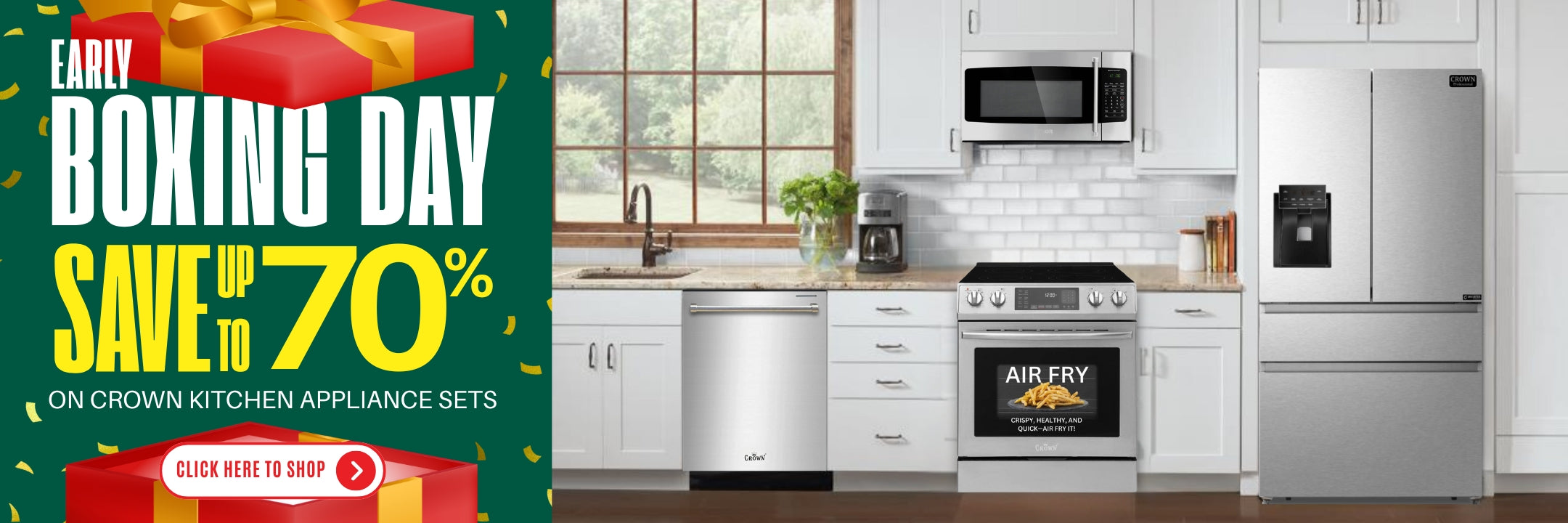Crown 4-Piece Bundle Set: 30" Electric Range + 30" Under Cabinet Range Hood + 36" Fridge + (FREE Gift) 24" Dishwasher