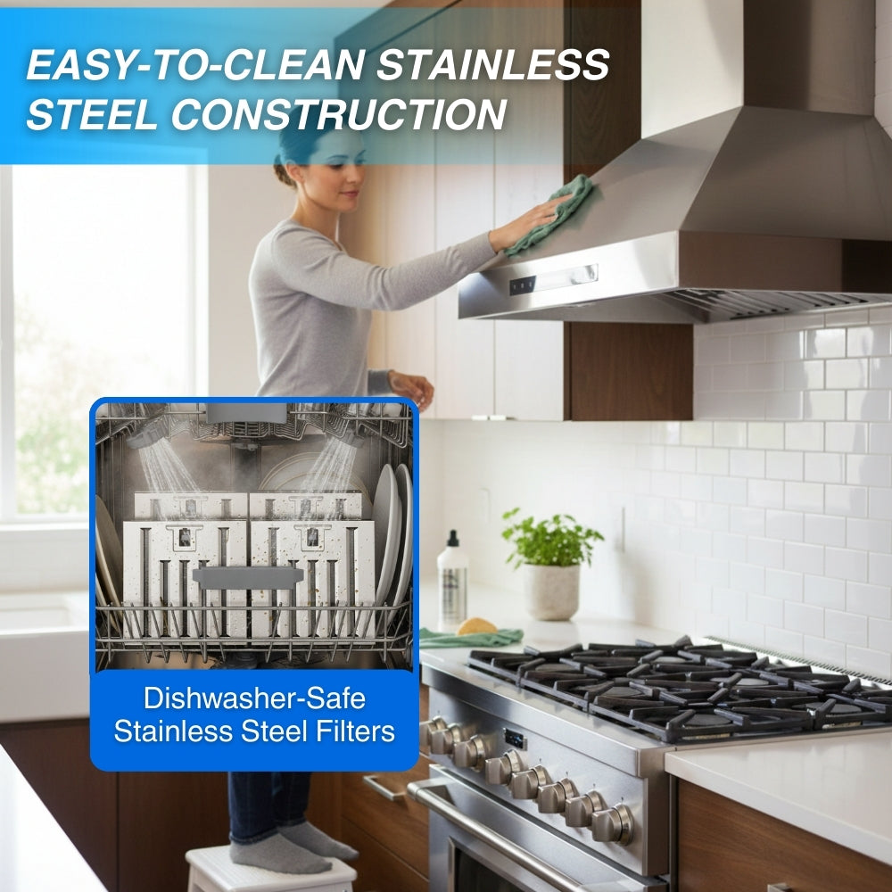 ✅ Le système dispose d'un évent par le haut avec un conduit rond de 15,2 cm. Niveau de bruit entre 1,5 et 4,5 sones. Comprend des filtres en acier inoxydable lavables au lave-vaisselle.