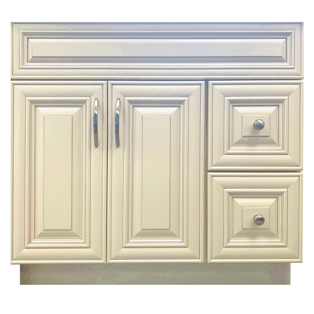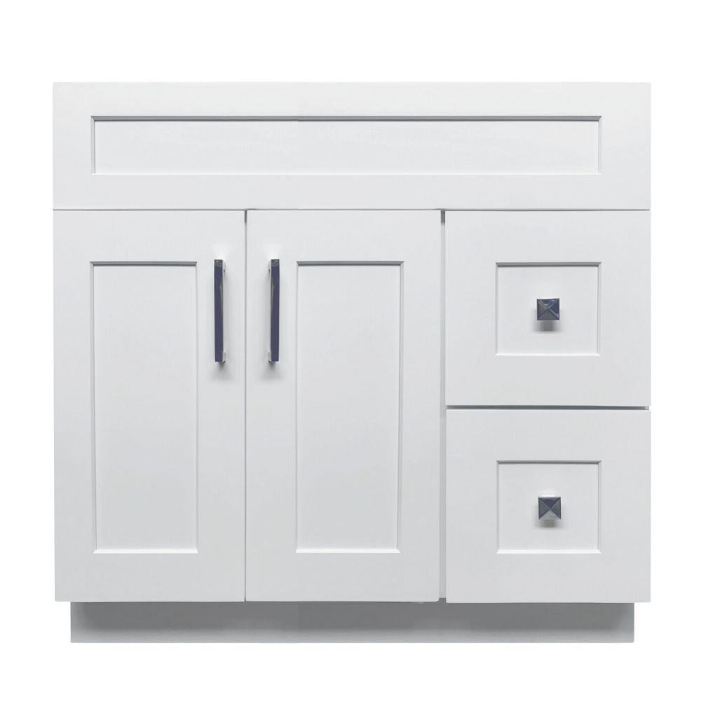 The 36 inch Solid Wood Bathroom Vanity features simple removable doors and drawers for easy inside cleaning. ‘L’ Bracket reinforces cabinets for heavy granite, marble, or other stone tops. Lot of space inside the cabinets to fit in all of your necessary items. Easy assembly and plumbing installation.