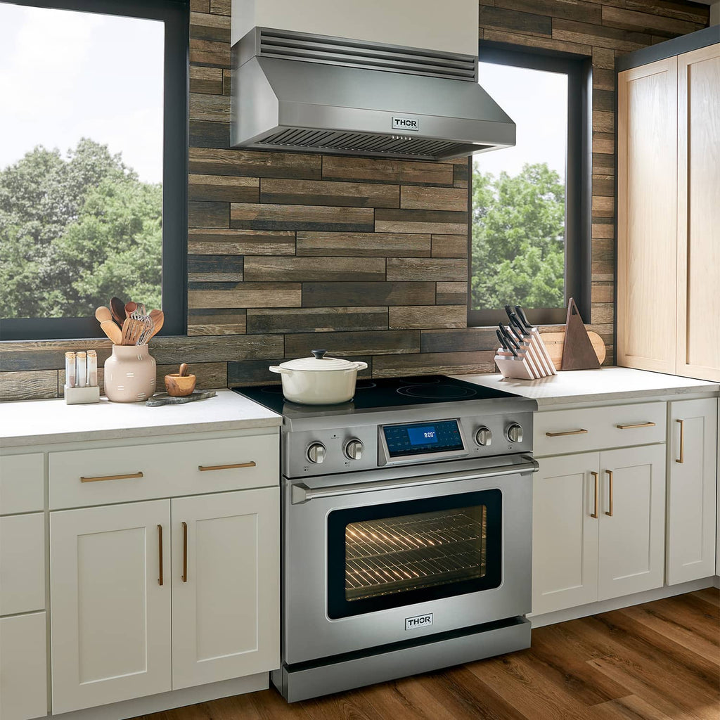 The THOR Kitchen 36 Inch Tilt Panel Electric Range is a professional stainless-steel machine designed with professional features and functionality. With easily accessible tilt panel touch controls, high-powered elements, and commercial convection fan, this electric range takes everything from prime rib to snickerdoodles to the next level.