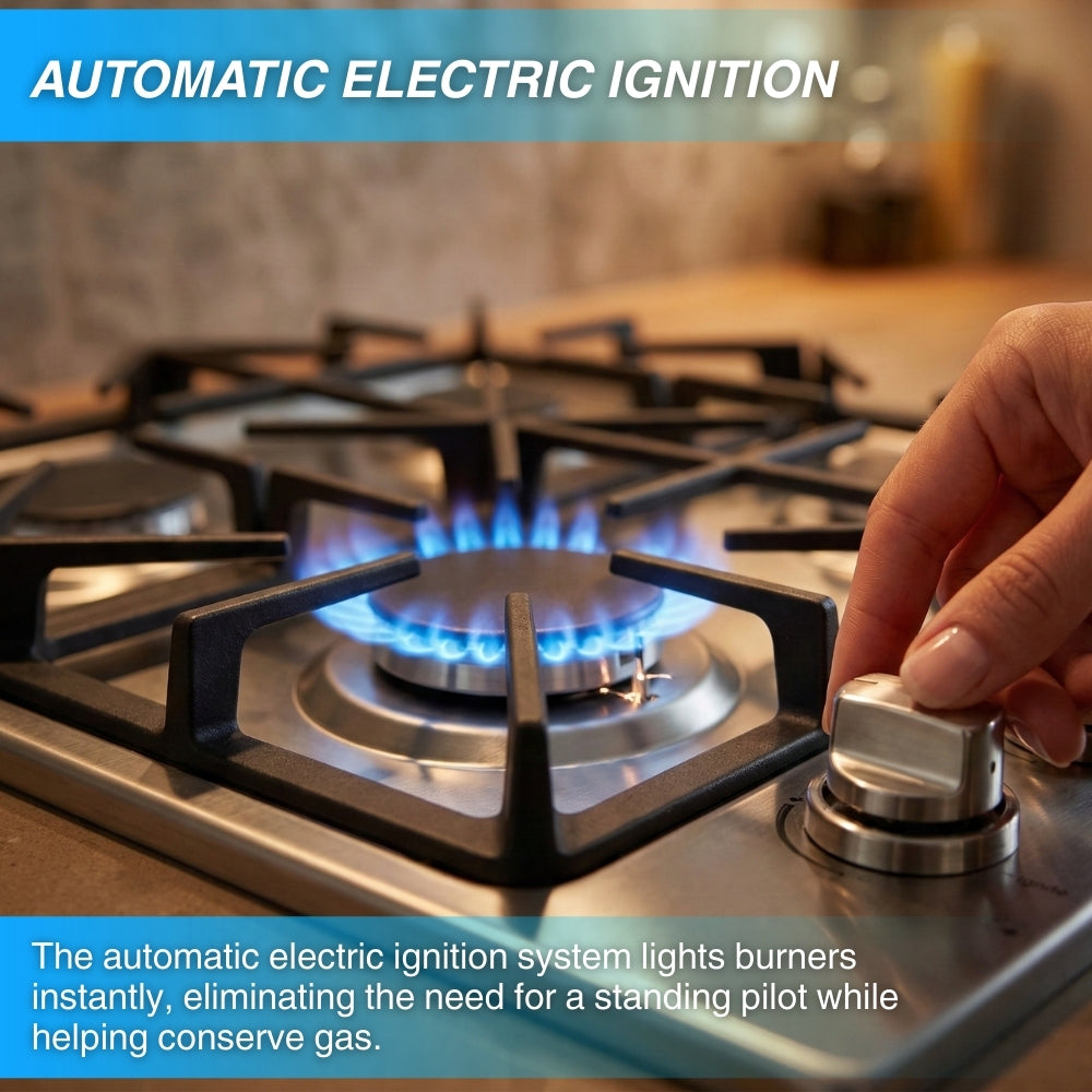 - Automatic Electric Ignition - Eliminates the need to light the burners and saves money by using less gas than a standing pilot range.