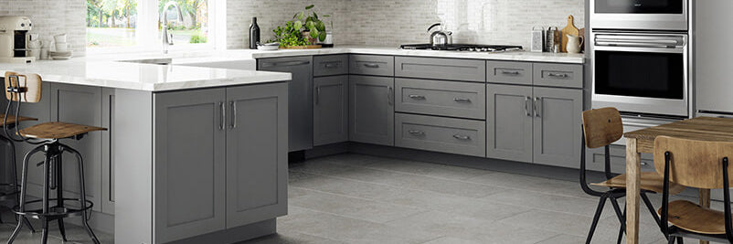 Crown 橱柜采用软关闭门和抽屉、可调节搁板和全覆盖设计,打造无缝外观。实木灰色 Shaker 厨房橱柜美观实用,可提升您的厨房档次。