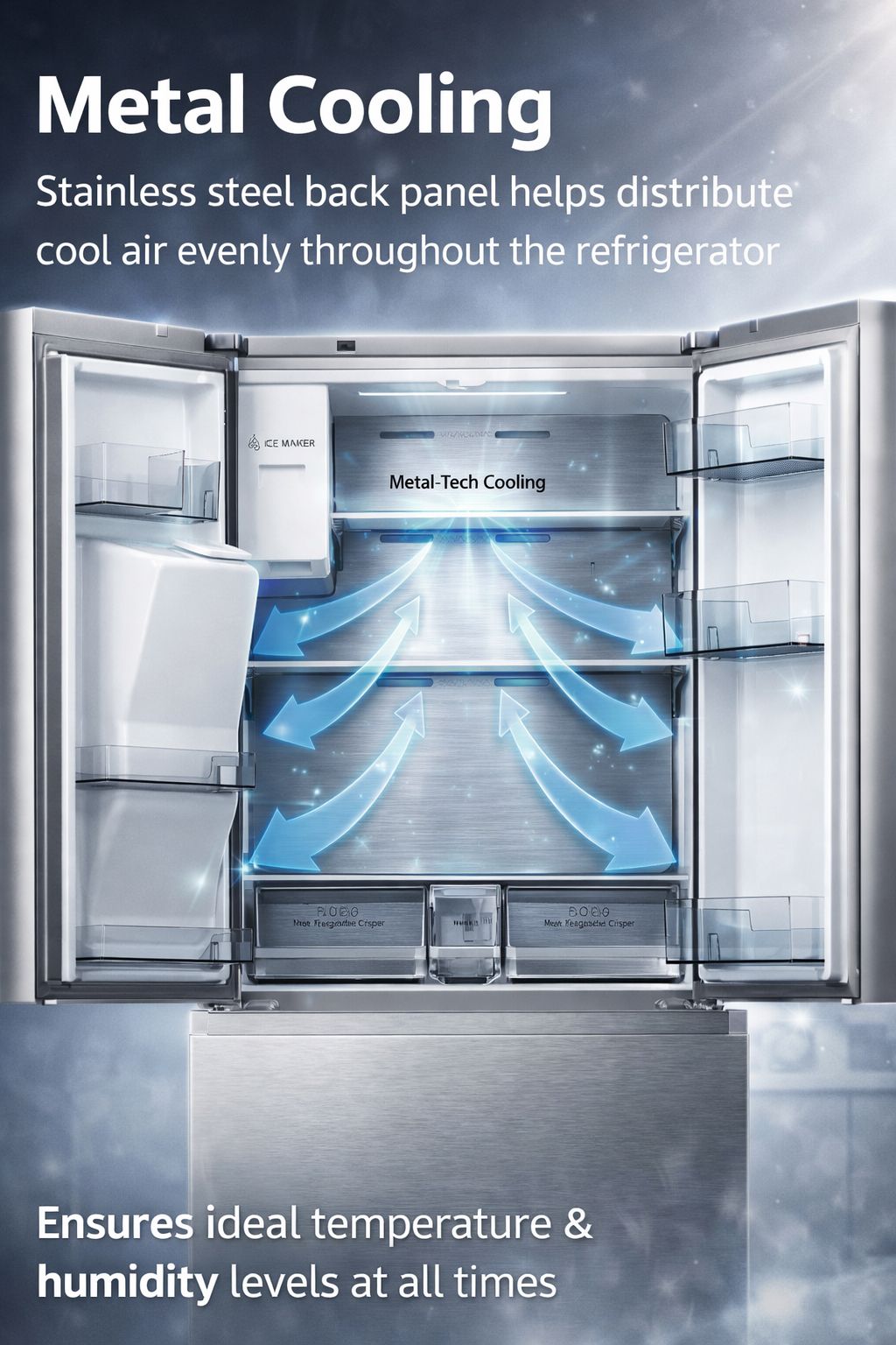 - 金属冷却-冰箱后壁覆盖不锈钢,确保冷空气从内到外均匀分布。这种先进技术的结合可确保始终保持理想的温度和湿度水平。