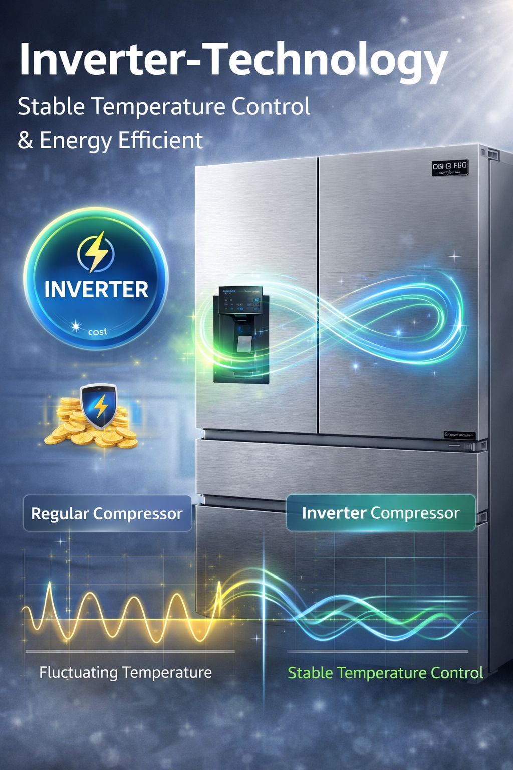 - 变频技术-采用变频技术的冰箱可为您的设备提供更稳定的温度控制。此外,变频产品更节能,可帮助您节省资金。
