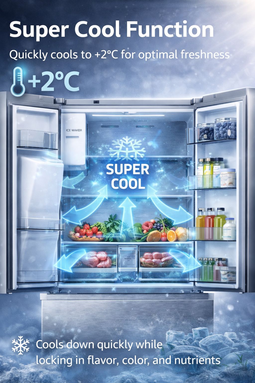 - 超级冷却功能-超级冷却功能可快速冷却内部温度,并使冰箱隔间保持常温 +2℃ 达 6 小时。这对保持新鲜食物的风味、颜色和营养价值大有裨益。
