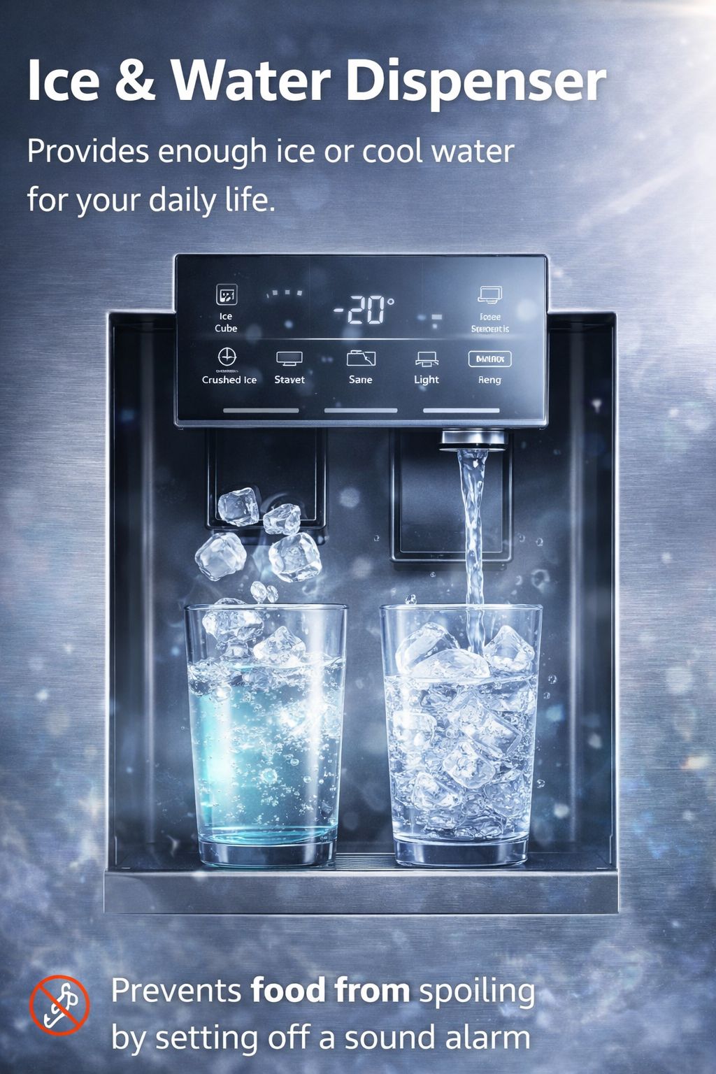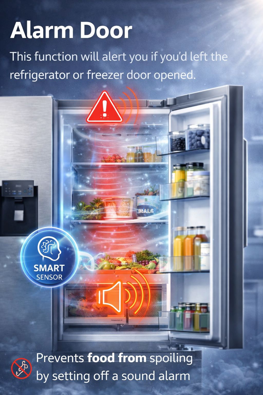 - 门警报-如果您忘记关冰箱或冷冻柜门,此功能会发出警报。智能传感器会检测到门是打开的,并会发出声音警报,以防止食物变质。