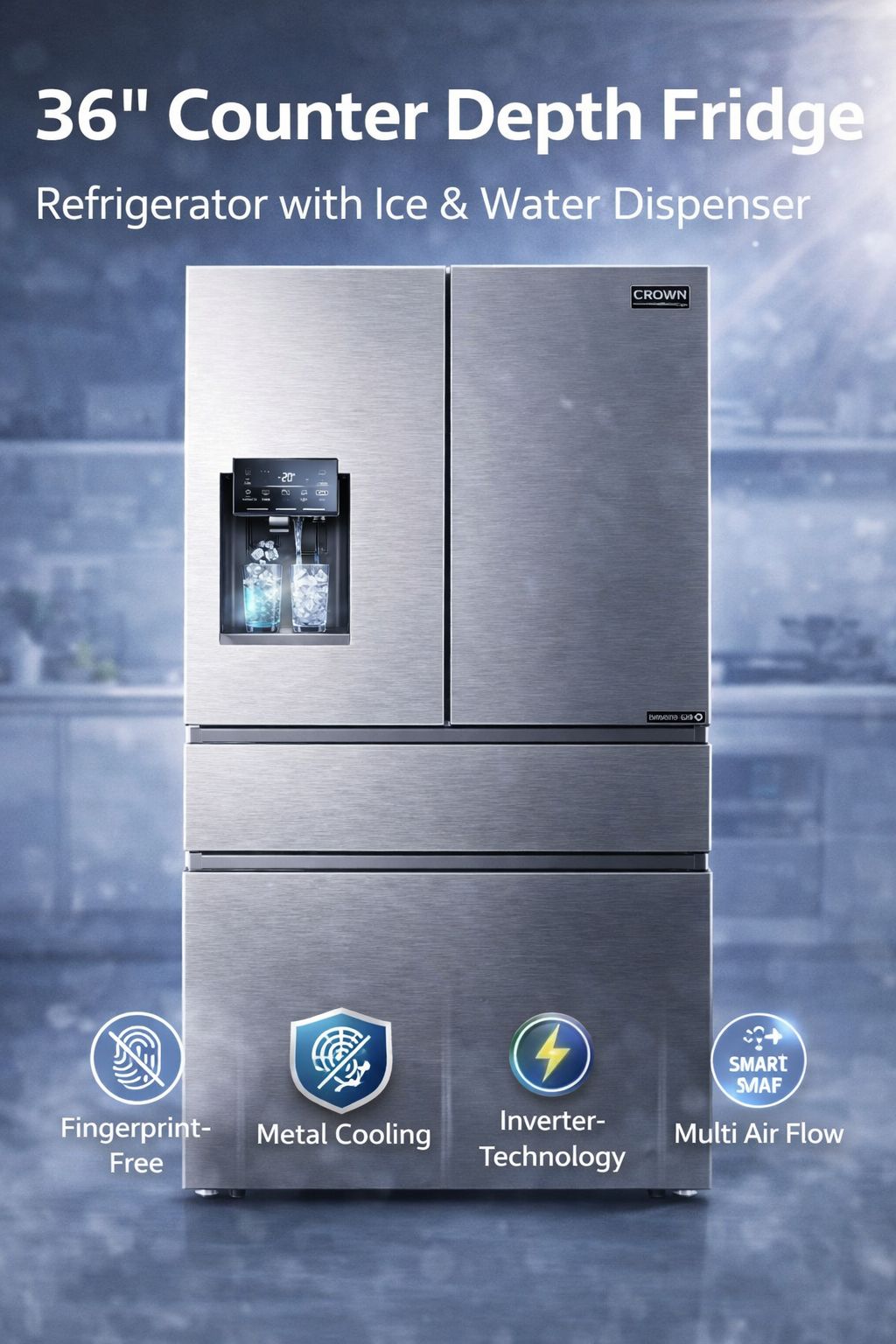 - 法式门冰箱-冷冻柜- 足够存放新鲜食物。新款 Crown 法式门冰箱宽度适中,采用优质平门设计,适合任何厨房。新型创新型冰水分配器可为您的日常生活提供足够的冰块或冷水。